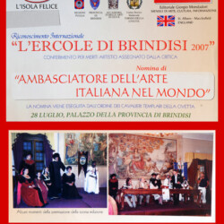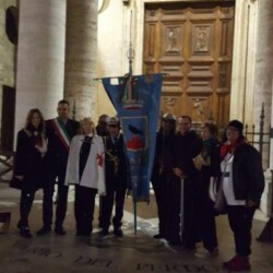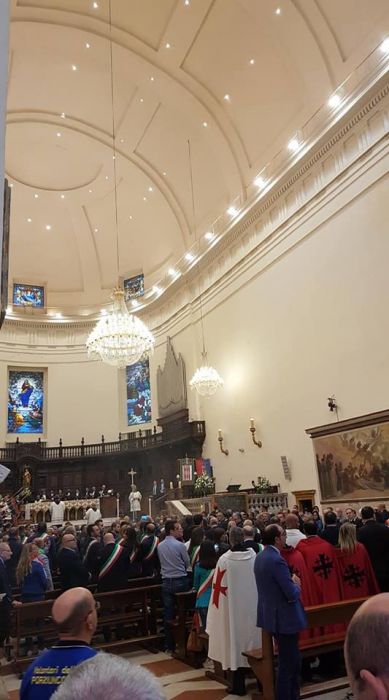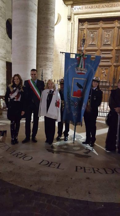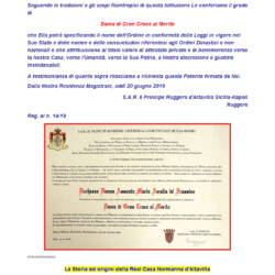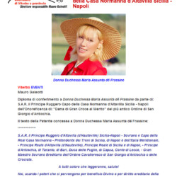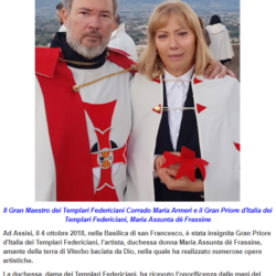 (NOMINA DI:"GRAN PRIORE D'ITALIA" DEI TEMPLARI FEDERICIANI). FRONTALMENTE A DX LA DUCHESSA DONNA "MARIA ASSUNTA dé FRASSINE" E "DAMA" DEI:"TEMPLARI FEDERICIANI" DALLE PROPRIE MANI DEL G.M. "CORRADO MARIA ARMERI" DEI "TEMPLARI FEDERICIANI" CON ONORE E COMMOZIONE ACCOGLIE NELLE SUE PROPRIE MANI LE "MOSTRINE" VERE E PROPRIE CON IL COLORE DISTINTIVO DEL ROSSO E LA "CROCE" ROSSA AD INDICARE L'APPARTENENZA DEI "TEMPLAI" AL "CRISTIANESIMO" E PER RICORDARE IL SANGUE VERSATO DI "CRISTO" CON IL DIRITTO DI APPLICARLA SULLA SPALLA SX VERSO IL CUORE DELLA PROPRIA MANTELLA TEMPLARE PER LA NOMINA AVVENUTA DI:" "GRAN PRIORE D'ITALIA" DEI "TEMPLARI FEDERICIANI".