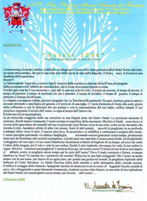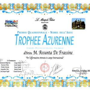 Concorso Internazionale per la narrativa: Preghiera senza Tempo per la sorte dell’ Uomo (non più di 31 righe). Conferita la Medaglia d’ oro all’ Artista N.D.: Sen. Dott.ssa Maria Assunta dé Frassine per la narrativa: Preghiera senza Tempo per la Sorte dell’ Uomo. Presidenza del Consiglio: Accademia Internazionale dei: Micenei – Presso il Palazzo di: Micene Comune di Reggio Calabria – Presidente Michele Alemanno.