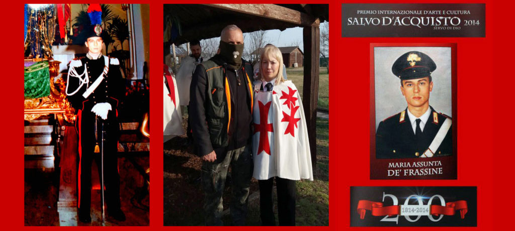 L’ Artista N.D. Maria Assunta DE’ Frassine con onore e commozione ha accolto nelle sue mani le ambite mostrine, distinte con il colore rosso e la croce rossa ad indicare l’appartenenza ai: Templari Federiciani e al Cristianesimo, per ricordare il Sangue Versato da Cristo.