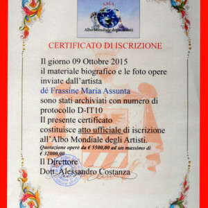 Ad Assisi, il 4 ottobre 2018, nella Basilica di San Francesco, è stata Insignita: Gran Priore d’Italia dei Templari Federiciani, l’Artista, Donna Duchessa Maria Assunta dè Frassine, amante della terra di Viterbo baciata da Dio, nella quale ha realizzato numerose Opere Artistiche.